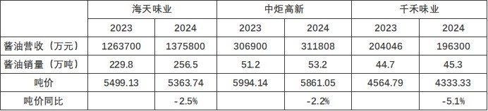 降价策略带来销量增长——海天味业销量增11.6%至256.5万吨,中炬高新增3.9%至53.2万吨,千禾味业微增1.3%至45.3万吨。不过,这样的增长代价沉重:海天味业营收增速(9%)显著低于销量增速,中炬高新营收仅增1.6%,千禾味业更因吨价暴跌导致酱油收入下降3.8%,陷“增量不增收”困局。