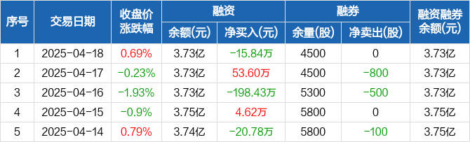 融资方面,当日融资买入320.4万元,融资偿还336.25万元,融资净偿还15.84万元。融券方面,融券卖出0股,融券偿还0股,融券余量4500股,融券余额7.83万元。融资融券余额合计3.73亿元。