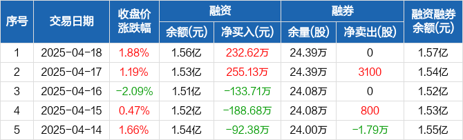 融资方面,当日融资买入520.95万元,融资偿还288.33万元,融资净买入232.62万元。融券方面,融券卖出0股,融券偿还0股,融券余量24.39万股,融券余额105.85万元。融资融券余额合计1.57亿元。