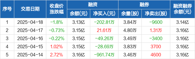 融资方面,当日融资买入825.81万元,融资偿还1028.62万元,融资净偿还202.81万元。融券方面,融券卖出300股,融券偿还9900股,融券余量3.84万股,融券余额66.89万元。融资融券余额合计3.14亿元。