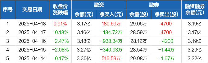 融资方面,当日融资买入904.47万元,融资偿还723.78万元,融资净买入180.69万元。融券方面,融券卖出6500股,融券偿还1800股,融券余量29.06万股,融券余额161.57万元。融资融券余额合计3.19亿元。