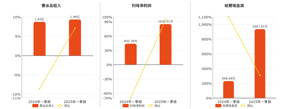 公司营业总收入为1.96亿元。归母净利润为1630.51万元。经营活动现金净流入为2467.81万元。