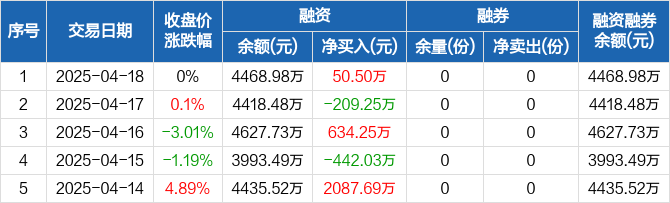 融资方面,当日融资买入1225.64万元,融资偿还1175.14万元,融资净买入50.5万元。融券方面,融券卖出0份,融券偿还0份,融券余量0份,融券余额0元。融资融券余额合计4468.98万元。