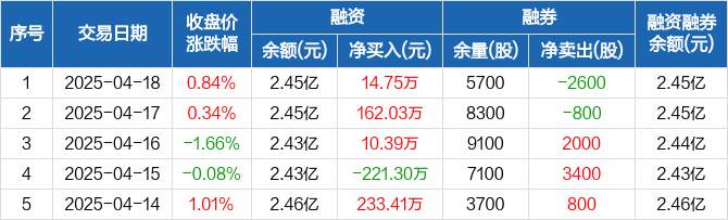融资方面,当日融资买入515.79万元,融资偿还501.04万元,融资净买入14.75万元,连续3日净买入累计187.17万元。融券方面,融券卖出100股,融券偿还2700股,融券余量5700股,融券余额6.83万元。融资融券余额合计2.45亿元。