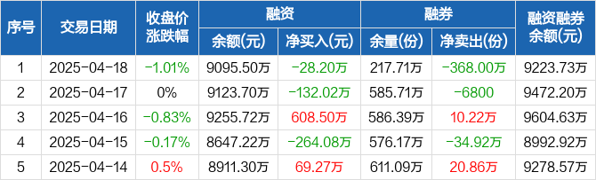 融资方面,当日融资买入796.77万元,融资偿还824.97万元,融资净偿还28.2万元。融券方面,融券卖出0份,融券偿还368万份,融券余量217.71万份,融券余额128.23万元。融资融券余额合计9223.73万元。