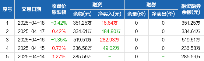 融资方面,当日融资买入91.9万元,融资偿还75.26万元,融资净买入16.64万元。融券方面,融券卖出0份,融券偿还0份,融券余量0份,融券余额0元。融资融券余额合计351.25万元。