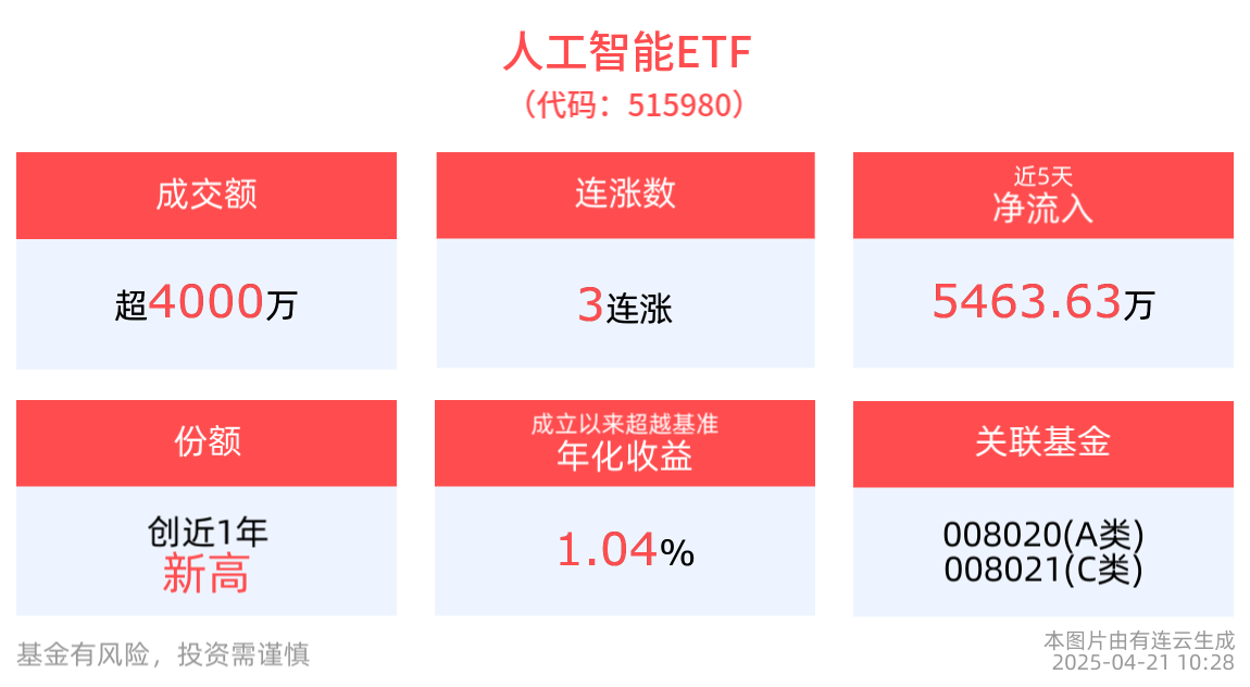 ETF方面,截至2025年4月21日 10:28,中证人工智能产业指数(931071)强势上涨1.08%,成分股寒武纪(688256)上涨5.48%,新易盛(300502)上涨3.29%,中际旭创(300308)上涨2.57%,广电运通(002152),协创数据(300857)等个股跟涨。人工智能ETF(515980)涨近1%, 冲击3连涨。拉长时间看,截至2025年4月18日,人工智能ETF近1年累计上涨23.65%。