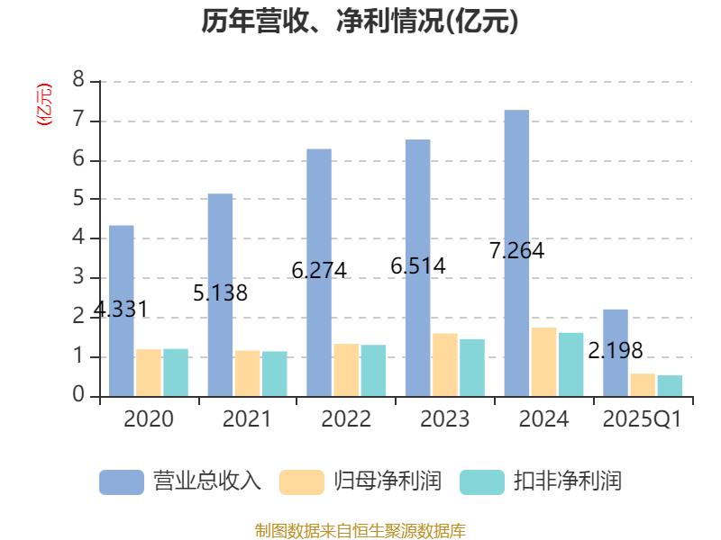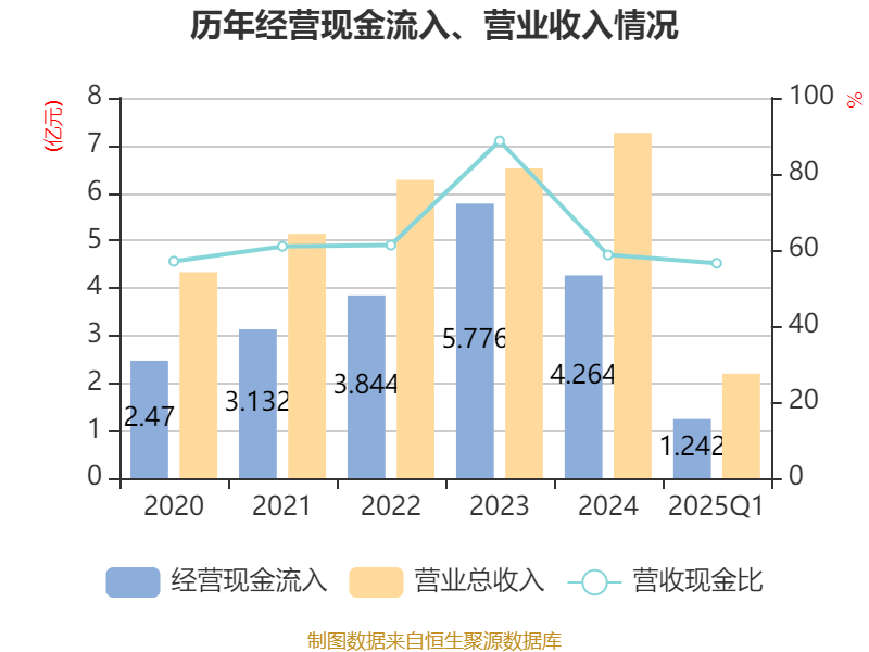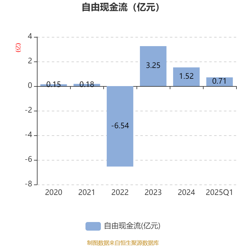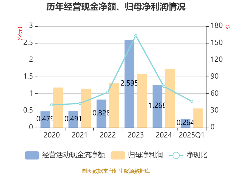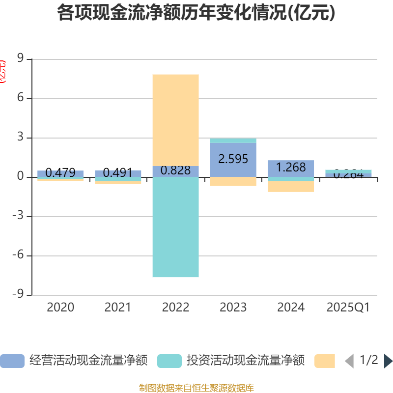 截至2025年一季度末,公司经营活动现金流净额为2641.35万元,同比增长38.36%;筹资活动现金流净额-81.01万元,同比减少36.74万元;投资活动现金流净额2721.5万元,上年同期为-4819.73万元。