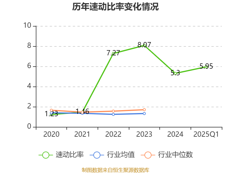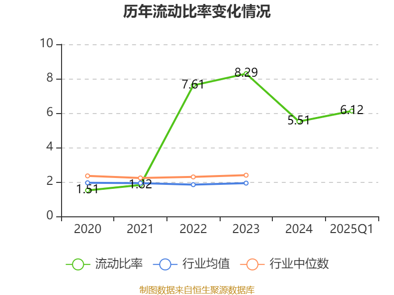 2025年第一季度,公司流动比率为6.12,速动比率为5.95。