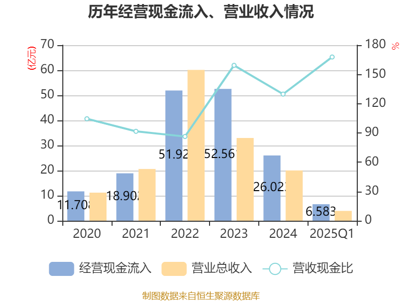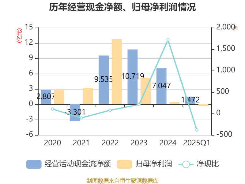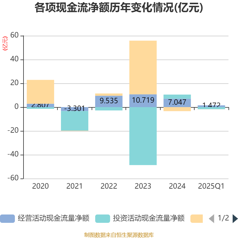 截至2025年一季度末,公司经营活动现金流净额为1.47亿元,同比下降29.99%;筹资活动现金流净额-627.29万元,同比增加3709.47万元;投资活动现金流净额-1.78亿元,上年同期为6.7亿元。