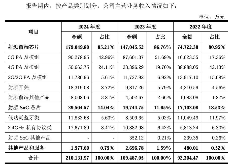 招股书(申报稿)显示,公司“5G PA及模组”业务2024年收入约为9.03亿元,虽然占主营业务的比重为42.96%,但相较于2023年的约8.76亿元仅上涨约3%。反观“4G PA及模组”业务,2024年收入约5.07亿元,较2023年的约3.34亿元上涨约52%。