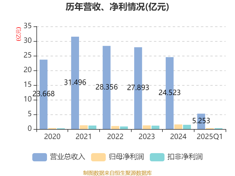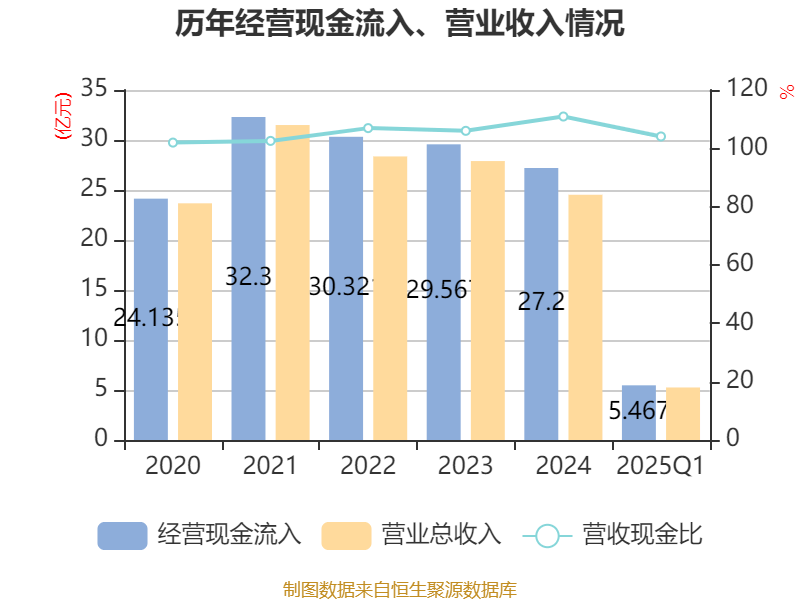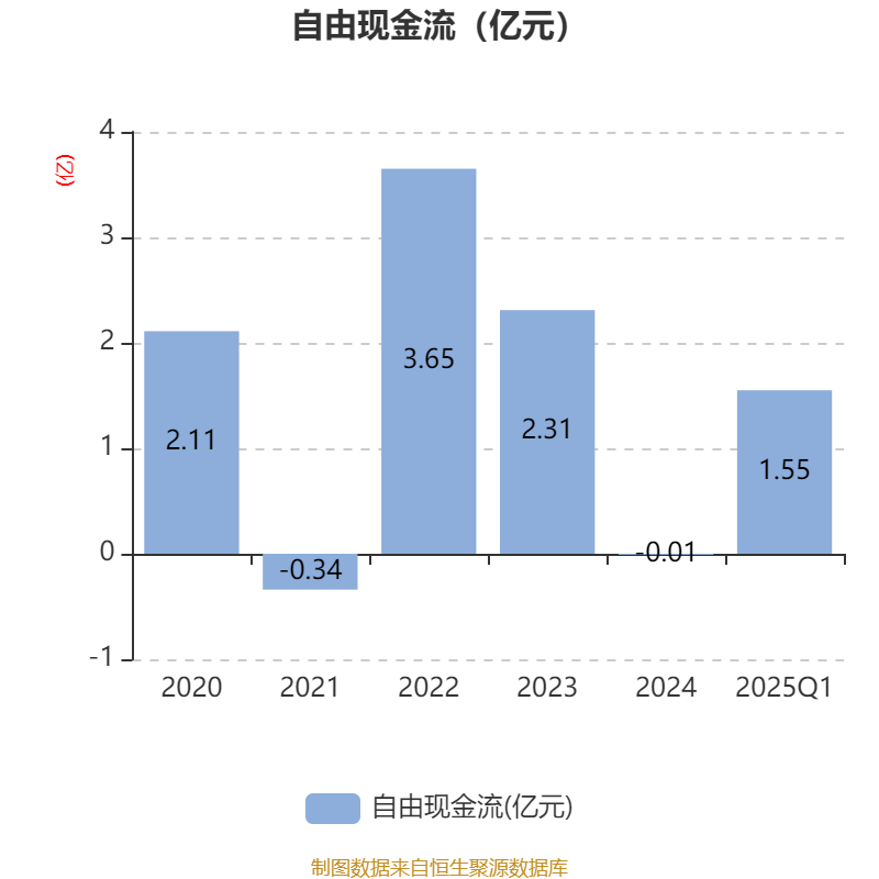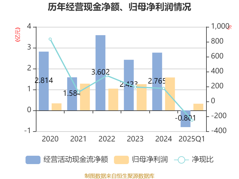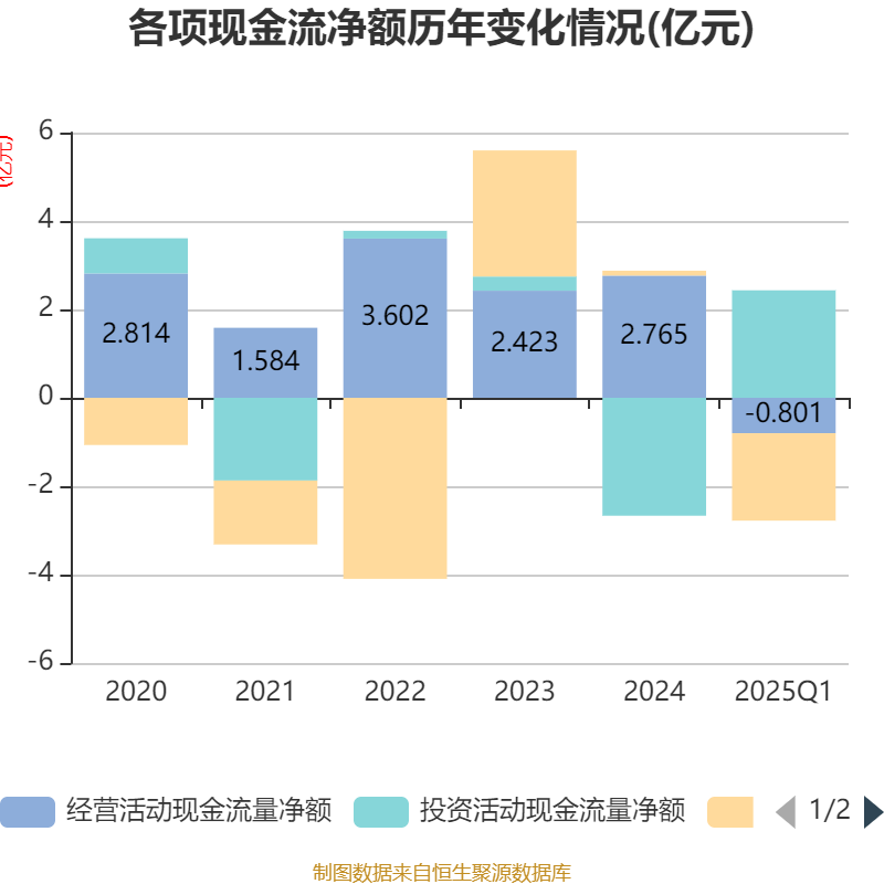 截至2025年一季度末,公司经营活动现金流净额为-8011.49万元,同比减少8840.1万元;筹资活动现金流净额-1.98亿元,同比减少2.48亿元;投资活动现金流净额2.43亿元,上年同期为-473.73万元。