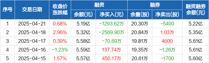融资方面,当日融资买入1560.5万元,融资偿还2854.12万元,融资净偿还1293.62万元,连续3日净偿还累计3934.21万元。融券方面,融券卖出500股,融券偿还5900股,融券余量20.3万股,融券余额270.4万元。融资融券余额合计5.22亿元。