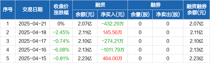 融资方面,当日融资买入615.01万元,融资偿还1047.29万元,融资净偿还432.29万元。融券方面,融券卖出0股,融券偿还0股,融券余量0股,融券余额0元。融资融券余额合计2.07亿元。