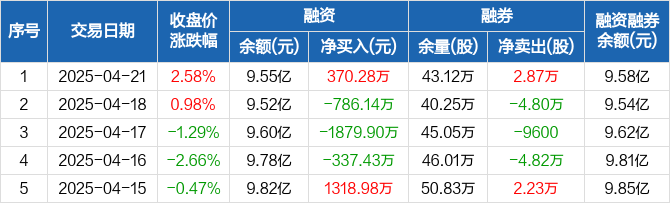 精达股份融资融券信息显示,2025年4月21日融资净买入370.28万元;融资余额9.55亿元,较前一日增加0.39%。