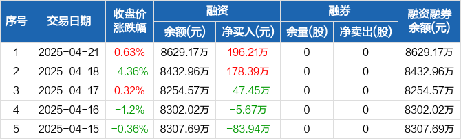 融资方面,当日融资买入375.92万元,融资偿还179.71万元,融资净买入196.21万元。融券方面,融券卖出0股,融券偿还0股,融券余量0股,融券余额0元。融资融券余额合计8629.17万元。