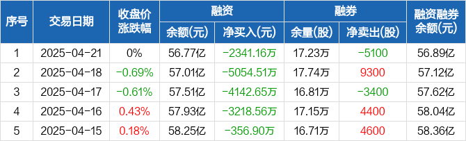 融资方面,当日融资买入1.78亿元,融资偿还2.01亿元,融资净偿还2341.16万元,连续5日净偿还累计1.51亿元。融券方面,融券卖出2700股,融券偿还7800股,融券余量17.23万股,融券余额1120.81万元。融资融券余额合计56.89亿元。
