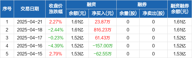 融资方面,当日融资买入695.5万元,融资偿还671.63万元,融资净买入23.87万元,连续3日净买入累计901.53万元。融券方面,融券卖出0股,融券偿还0股,融券余量0股,融券余额0元。融资融券余额合计1.61亿元。