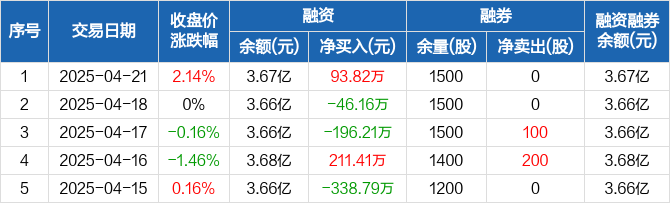 融资方面,当日融资买入754.9万元,融资偿还661.08万元,融资净买入93.82万元。融券方面,融券卖出0股,融券偿还0股,融券余量1500股,融券余额9315元。融资融券余额合计3.67亿元。