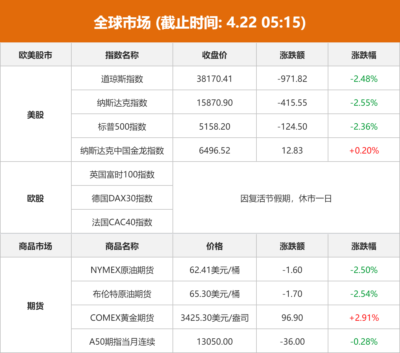 美股市场:美股三大指数21日显著下跌。截至当天收盘,道琼斯工业平均指数比前一交易日下跌971.82点,收于38170.41点,跌幅为2.48%;标准普尔500种股票指数下跌124.50点,收于5158.20点,跌幅为2.36%;纳斯达克综合指数下跌415.55点,收于15870.90点,跌幅为2.55%。