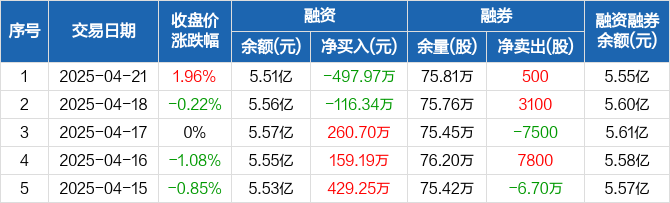 融资方面,当日融资买入752.87万元,融资偿还1250.84万元,融资净偿还497.97万元。融券方面,融券卖出500股,融券偿还0股,融券余量75.81万股,融券余额354.8万元。融资融券余额合计5.55亿元。
