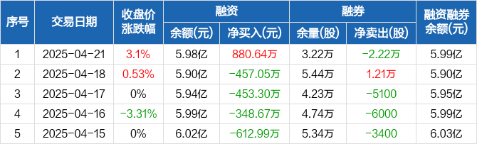 融资方面,当日融资买入3486.26万元,融资偿还2605.63万元,融资净买入880.64万元。融券方面,融券卖出2300股,融券偿还2.45万股,融券余量3.22万股,融券余额43.89万元。融资融券余额合计5.99亿元。