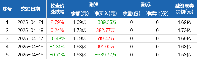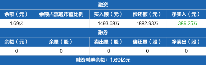 融资方面,当日融资买入1493.68万元,融资偿还1882.93万元,融资净偿还389.25万元。融券方面,融券卖出0份,融券偿还0份,融券余量0份,融券余额0元。融资融券余额合计1.69亿元。