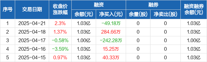 融资方面,当日融资买入501.1万元,融资偿还550.28万元,融资净偿还49.18万元。融券方面,融券卖出0股,融券偿还0股,融券余量0股,融券余额0元。融资融券余额合计1.03亿元。