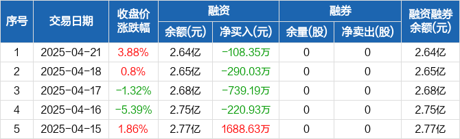融资方面,当日融资买入2579.68万元,融资偿还2688.03万元,融资净偿还108.35万元,连续4日净偿还累计1358.5万元。融券方面,融券卖出0股,融券偿还0股,融券余量0股,融券余额0元。融资融券余额合计2.64亿元。