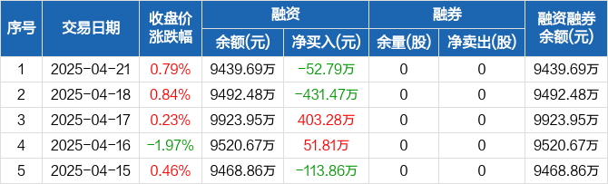 融资方面,当日融资买入454.64万元,融资偿还507.43万元,融资净偿还52.79万元。融券方面,融券卖出0股,融券偿还0股,融券余量0股,融券余额0元。融资融券余额合计9439.69万元。