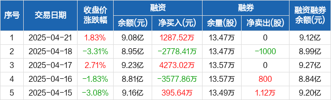 融资方面,当日融资买入6805.97万元,融资偿还5518.45万元,融资净买入1287.52万元。融券方面,融券卖出0股,融券偿还0股,融券余量13.47万股,融券余额336.62万元。融资融券余额合计9.12亿元。