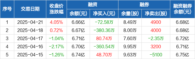 融资方面,当日融资买入2798.9万元,融资偿还2871.48万元,融资净偿还72.58万元。融券方面,融券卖出5000股,融券偿还100股,融券余量8.49万股,融券余额135.16万元。融资融券余额合计6.68亿元。