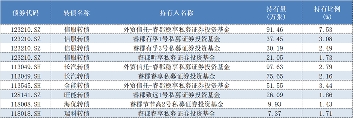 此外,截至去年年底时,睿郡资产相关产品还持有51.55万张金能转债(113545.SH)、26.09万张旺能转债(128141.SZ),还有部分海优转债(118008.SH)和瑞科转债(118018.SH)。
