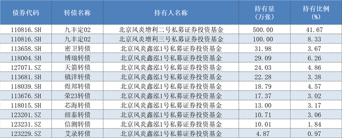 其中,最受青睐的当属九丰定02,Wind数据显示,截至2024年12月31日,“北京风炎增利二号”和“北京风炎增利三号”分别为该可转债的第一和第四大持有人,累计持仓数量为600万张,并且截至2023年年底和2024年6月底时两产品持仓该可转债的数量合计也均为600万张。