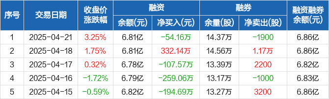 融资方面,当日融资买入3201.13万元,融资偿还3255.29万元,融资净偿还54.16万元。融券方面,融券卖出2000股,融券偿还3900股,融券余量14.37万股,融券余额474.93万元。融资融券余额合计6.86亿元。