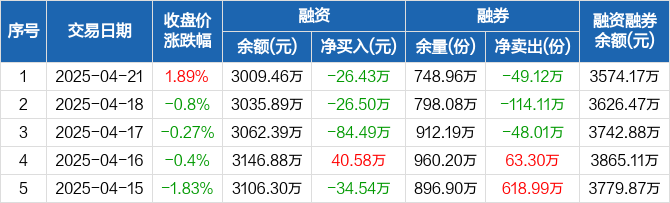 融资方面,当日融资买入309.56万元,融资偿还335.99万元,融资净偿还26.43万元,连续3日净偿还累计137.42万元。融券方面,融券卖出34.46万份,融券偿还83.58万份,融券余量748.96万份,融券余额564.72万元。融资融券余额合计3574.17万元。