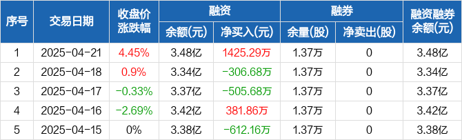 新时达融资融券信息显示,2025年4月21日融资净买入1425.29万元;融资余额3.48亿元,较前一日增加4.27%。