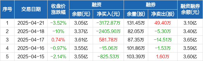 融资方面,当日融资买入4489.38万元,融资偿还7662.25万元,融资净偿还3172.87万元。融券方面,融券卖出49.92万股,融券偿还5200股,融券余量131.45万股,融券余额467.96万元。融资融券余额合计3.1亿元。