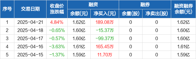 融资方面,当日融资买入590.01万元,融资偿还400.93万元,融资净买入189.08万元。融券方面,融券卖出0股,融券偿还0股,融券余量0股,融券余额0元。融资融券余额合计1.62亿元。