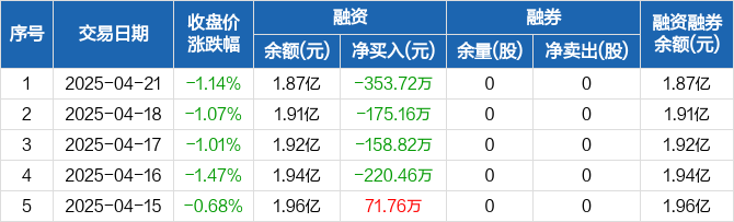 融资方面,当日融资买入792.43万元,融资偿还1146.14万元,融资净偿还353.72万元,连续4日净偿还累计908.16万元。融券方面,融券卖出0股,融券偿还0股,融券余量0股,融券余额0元。融资融券余额合计1.87亿元。