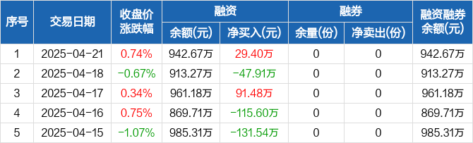 融资方面,当日融资买入114.57万元,融资偿还85.17万元,融资净买入29.4万元。融券方面,融券卖出0份,融券偿还0份,融券余量0份,融券余额0元。融资融券余额合计942.67万元。
