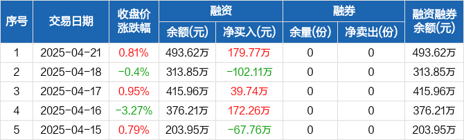 融资方面,当日融资买入263.09万元,融资偿还83.32万元,融资净买入179.77万元。融券方面,融券卖出0份,融券偿还0份,融券余量0份,融券余额0元。融资融券余额合计493.62万元。