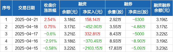 融资方面,当日融资买入1122.81万元,融资偿还964.67万元,融资净买入158.14万元。融券方面,融券卖出900股,融券偿还7200股,融券余量2.92万股,融券余额20万元。融资融券余额合计3.19亿元。