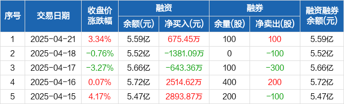 融资方面,当日融资买入7001.38万元,融资偿还6325.94万元,融资净买入675.45万元。融券方面,融券卖出100股,融券偿还0股,融券余量100股,融券余额1487元。融资融券余额合计5.59亿元。