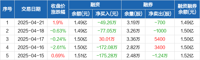 融资方面,当日融资买入235.83万元,融资偿还285.08万元,融资净偿还49.26万元。融券方面,融券卖出0股,融券偿还700股,融券余量3.19万股,融券余额40.96万元。融资融券余额合计1.49亿元。