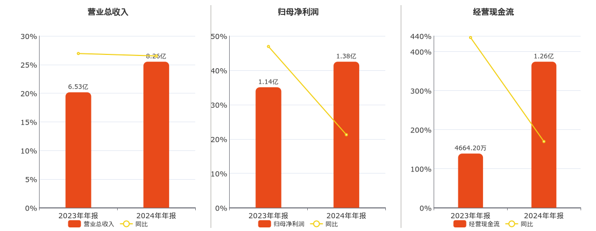 公司营业总收入为8.26亿元。归母净利润为1.38亿元。经营活动现金净流入为1.26亿元。