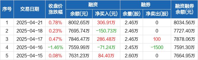 融资方面,当日融资买入597.42万元,融资偿还290.51万元,融资净买入306.91万元。融券方面,融券卖出0股,融券偿还0股,融券余量2.46万股,融券余额31.91万元。融资融券余额合计8034.56万元。