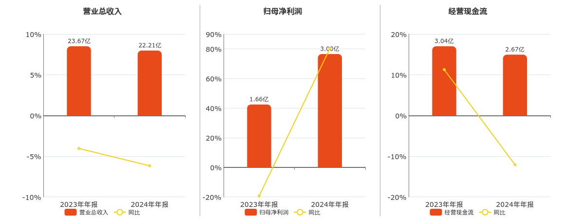 公司营业总收入为22.21亿元,较去年同报告期营业总收入减少1.46亿元,同比较去年同期下降6.18%。归母净利润为3.00亿元。经营活动现金净流入为2.67亿元,较去年同报告期经营活动现金净流入减少3677.94万元,同比较去年同期下降12.09%。