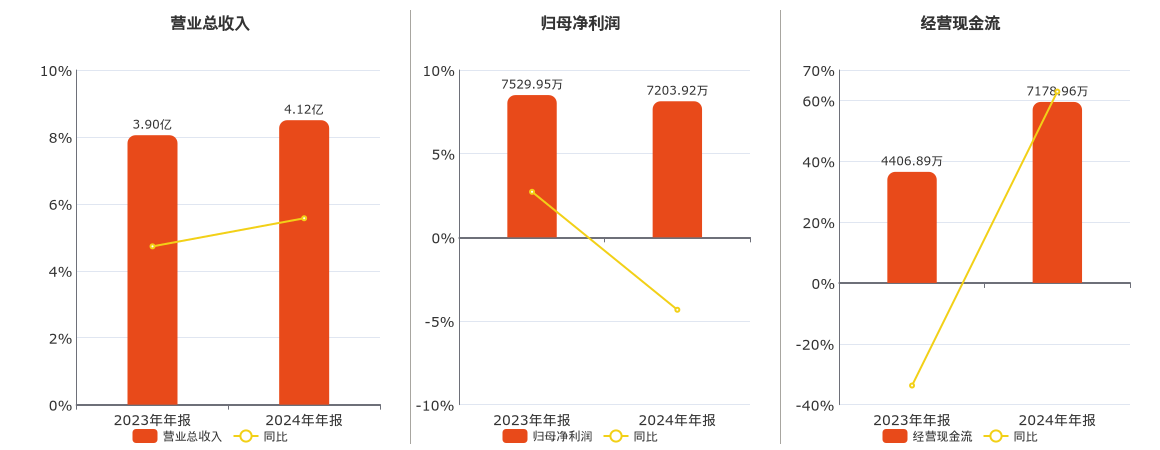 公司营业总收入为4.12亿元,在已披露的同业公司中排名第33。归母净利润为7203.92万元,在已披露的同业公司中排名第22,较去年同报告期归母净利润减少326.03万元,同比较去年同期下降4.33%。经营活动现金净流入为7178.96万元,在已披露的同业公司中排名第20。