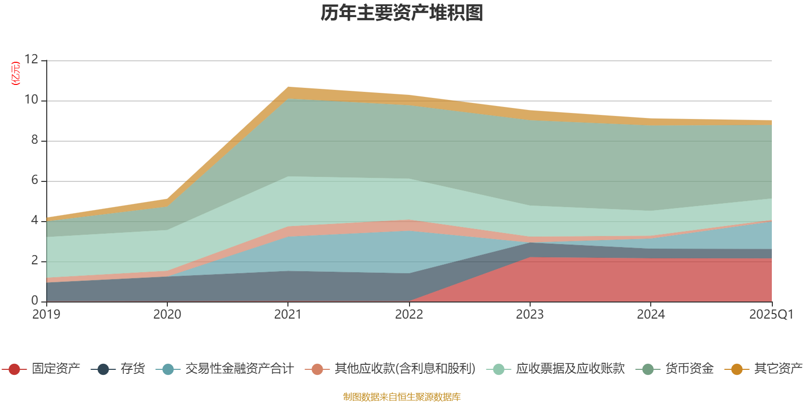 资产重大变化方面,截至2025年一季度末,公司交易性金融资产合计较上年末增加171.45%,占公司总资产比重上升9.61个百分点;货币资金较上年末减少13.9%,占公司总资产比重下降6.07个百分点;应收票据及应收账款较上年末减少13.69%,占公司总资产比重下降1.74个百分点;预付款项较上年末减少49.74%,占公司总资产比重下降1.05个百分点。